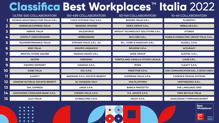 Pubblicata il 31 marzo la classifica delle realtà aziendali più attente al benessere dei lavoratori in Italia secondo Great Place To Work. Ecco dove si lavora meglio.